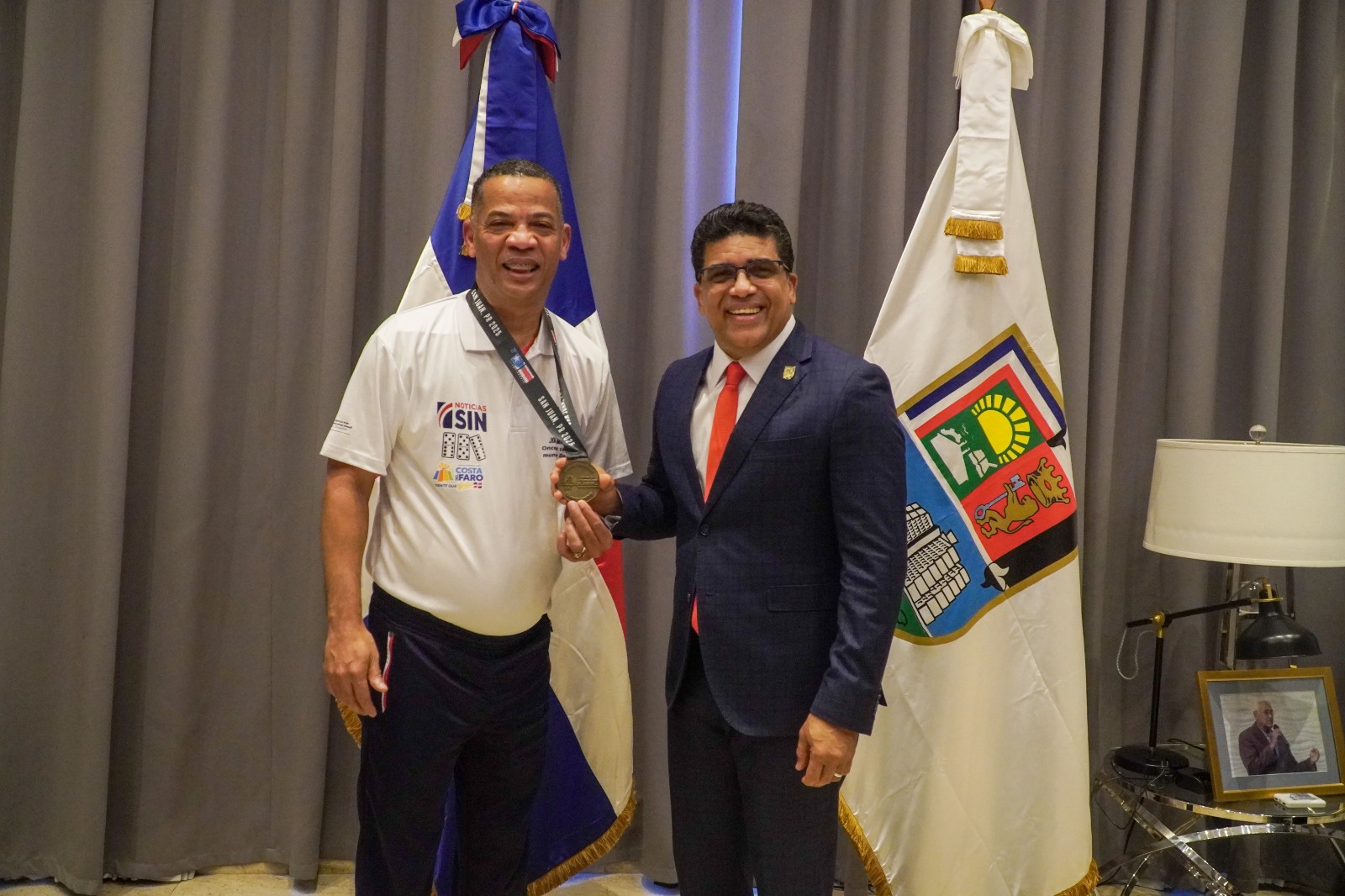 Santo Domingo Este. – El alcalde del Ayuntamiento de Santo Domingo Este (ASDE), Dío Astacio, recibió en su despacho al dominicano Joaquín Martínez, tras conquistar su medalla de oro número 12 en el 21º Campeonato Mundial de Dominó, celebrado en San Juan, Puerto Rico.