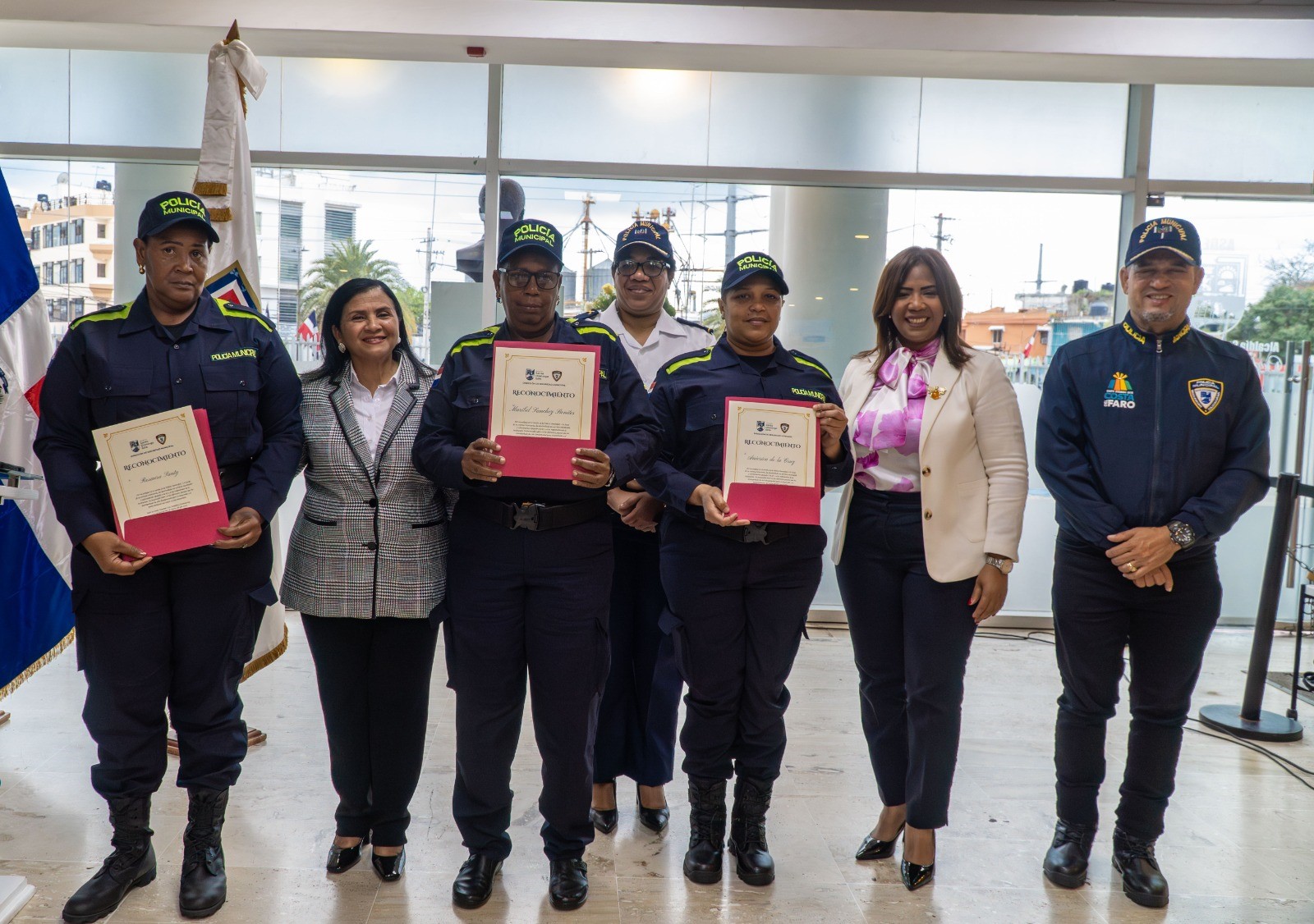 En la ceremonia fueron reconocidas las agentes Rosaura Santy, Anierica de la Cruz y Maribel Sánchez Benítez, quienes cuentan con 16, 20 y 28 años de servicio, respectivamente, dentro de la Policía Municipal de Santo Domingo Este.