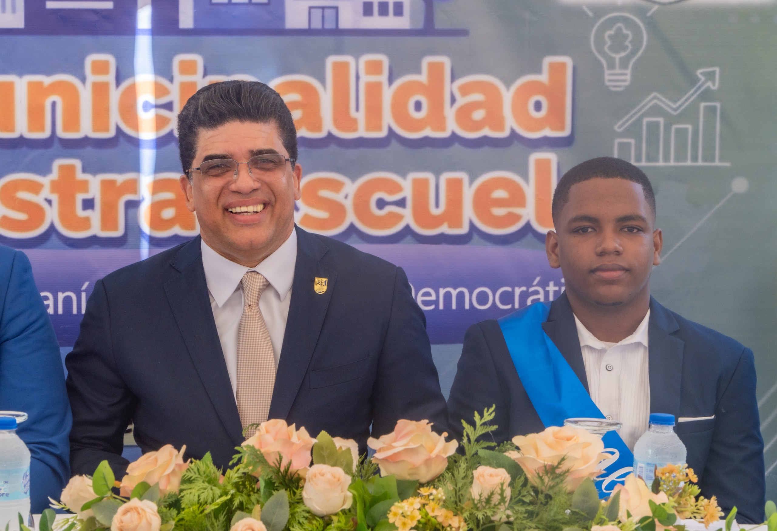 El alcalde Astacio y el director De Paula colocaron las bandas y juramentaron al alcalde estudiantil José Rondón, a la vicealcaldesa Ismal Terrero y a los regidores electos, en presencia de autoridades municipales y educativas que integraron la mesa principal: Gabriel Estévez, director de la Juventud del ASDE; Víctor Féliz Solano, presidente de Municipalidad Global; Mariano Cuello Ozuna, director Distrital; Idelfi Moreno, del Viceministerio de Servicios Técnicos y Pedagógicos del MINERD; y Norberto Alcántara Peña, técnico distrital.